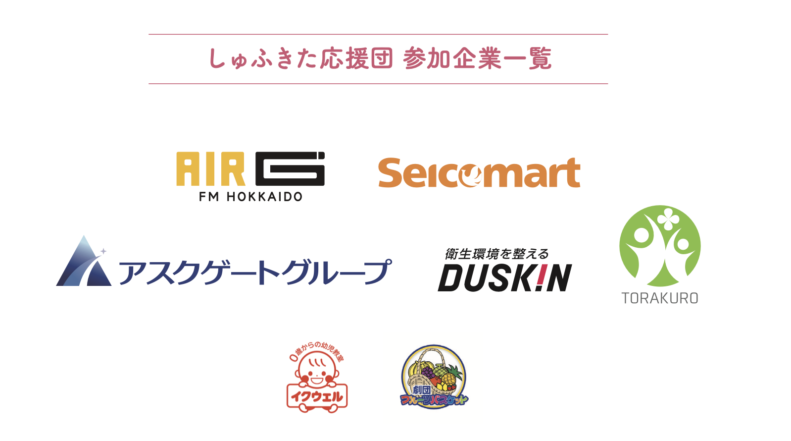 しゅふきた応援団は「主婦の笑顔を増やしたい!」という《(株)北海道アルバイト情報社》の思いに共感してくれた企業の皆さまと結ぶパートナーシップ。「お仕事さがしフェア」などのしゅふきたイベントを通じ、求人情報だけではない、おトク情報やお役立ち情報など、働く主婦を応援するさまざまなコンテンツを発信していきます。